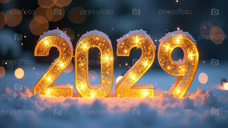 Прозрачные золотые светящиеся числа 2029 на снежном фоне Нового года с золотистыми гирляндами боке, секины, звезды, снег, блеск. Поздравления, открытка. Календарь, обложка. AI generated