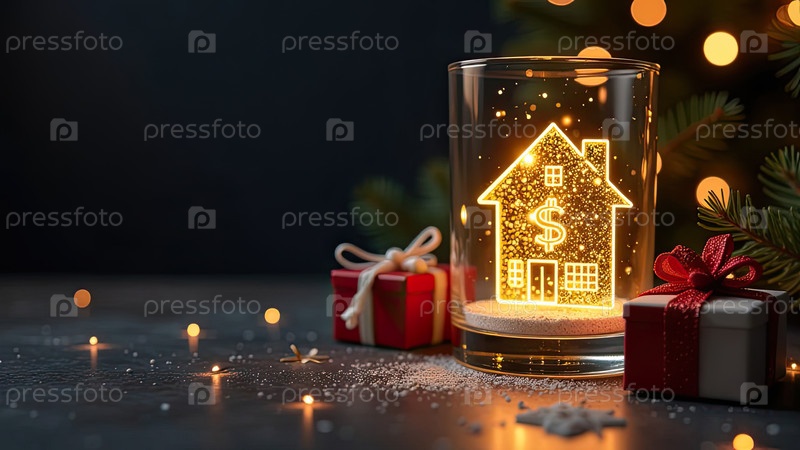 Прозрачное золото светящийся символ дома и коробка для подарков под елкой на рождественском фоне с золотым блеском