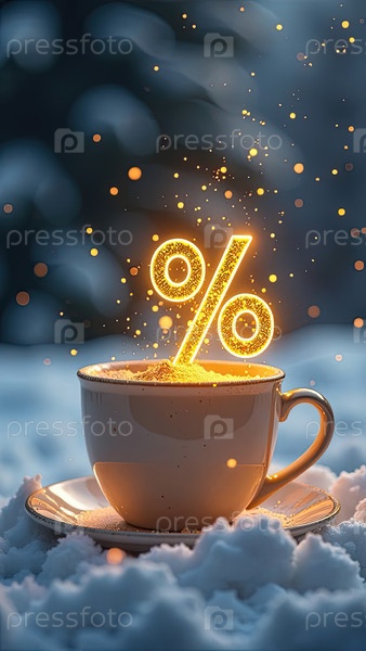 Неон светящийся золотой процентный знак на кружке с горячим кофейным напитком, паромом, блеском и снегом. зимние распродажи и жаркие скидки, Черная пятница, Новый год, Рождество. баннер, флаер с копировальным пространством. AI generated