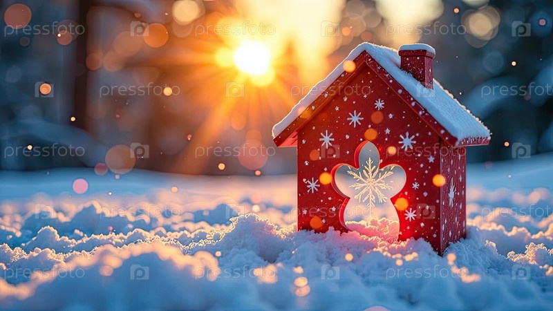 Уютный крошечный дом на снегу и заснеженном фоне в солнечных лучах, украшенный рождественским декором. недвижимость, риэлтор, ипотека, страхование, бронирование, зимовка, изоляция, отопление. ИИ генерируется