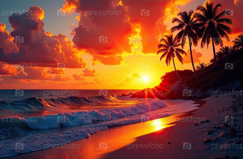 Панорамный закат океана, силуэты пальм, яркий тропический фон для летних объявлений или социальных баннеров