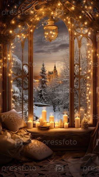 Внутреннее уютное окно с рождественским декором и теплым светом - вид изнутри зимой и снегом. отпразднуйте Рождество и Новый год, елку, боке, снег. ИИ генерируется