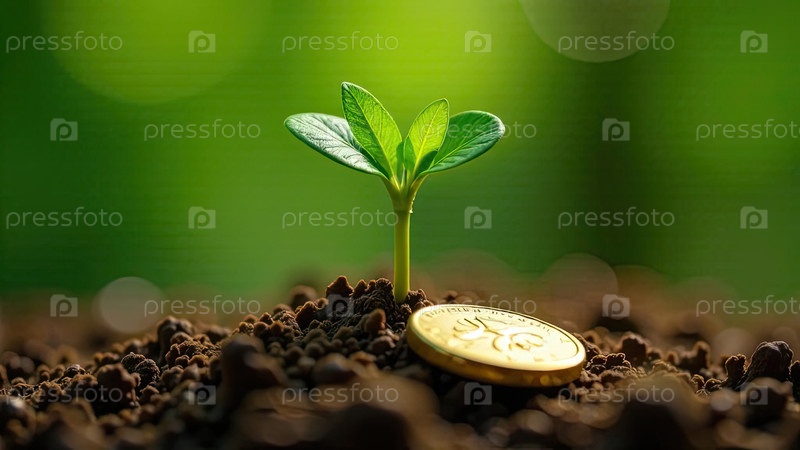 Молодой зеленый побег растет из земли и золотые монеты вблизи на зеленом фоне. Экономика, финансы, экология, стартап. ИИ генерируется