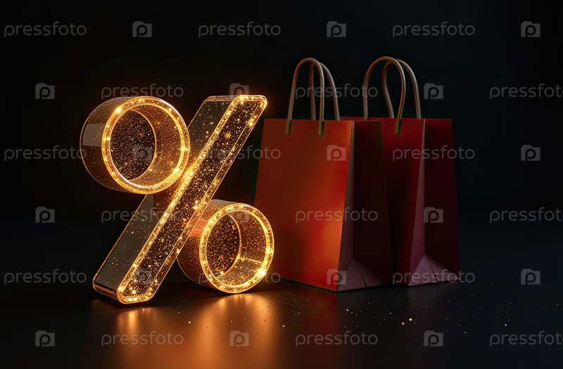 Неон светящийся золотой процентный знак на черном фоне. витрина магазина для Черной пятницы, распродажи, скидки, сумки для покупок. баннер, флаер. AI generated