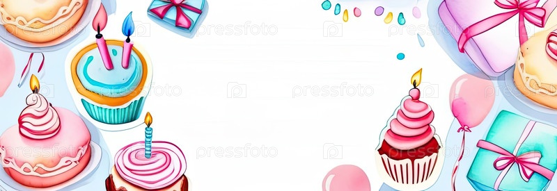 Горизонтальные сладкие пастельные границы, макароны и кексы акварельная рама, пространство для копирования поздравительных открыток для сообщения