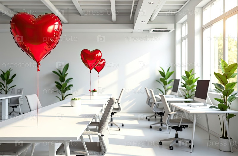 Офис - это открытое пространство, украшенное красными воздушными шарами в форме сердца на День святого Валентина, рабочие места с компьютерами, горшечные растения. Корпоративная вечеринка, праздник, приветствия сотрудников. ИИ генерируется