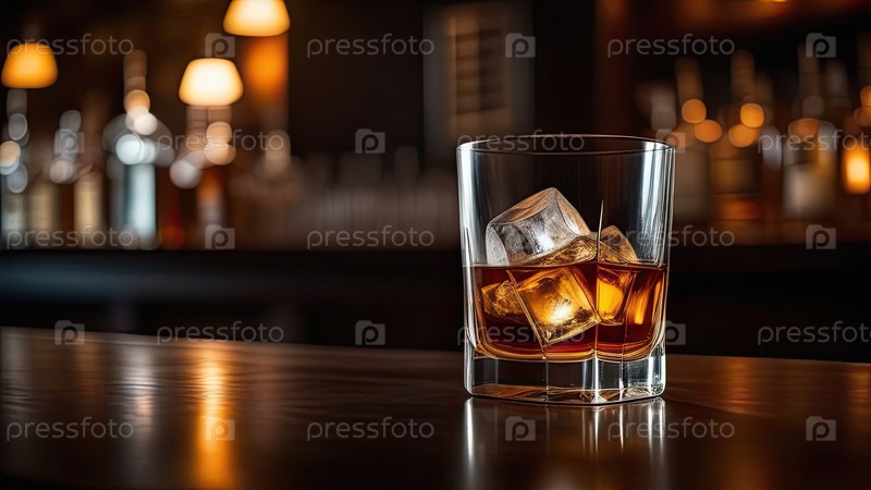 Горизонтальный стакан виски, расслабленная сцена в баре, приглашающая к промокодам коктейлей, элегантный спиртный фон, пространство для копирования