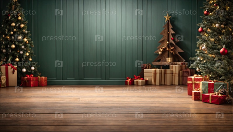 Пустой деревянный пол в нейтральных тонах для отображения продукции со стеной во внутренней части комнаты в зеленых и коричневых тонах, с рождественским декором. Копирование пространства, Рождество и Новый год. ИИ генерируется