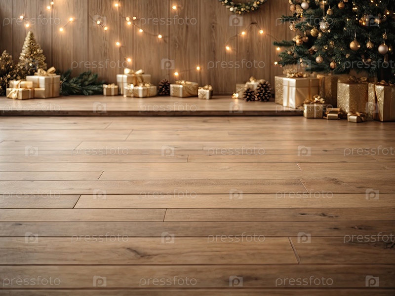 Пустой деревянный пол в нейтральных естественных бежевых тонах для отображения продукции со стеной во внутренней части комнаты, с рождественским декором. Копирование пространства, Рождество и Новый год. ИИ генерируется
