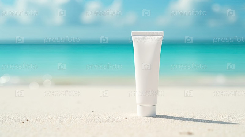 Белая трубка макет солнцезащитного крема на белом песке пляжа на фоне синего океана. Ультрафиолетовая защита кожи, солнцезащитный крем. ИИ генерируется