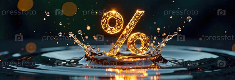 Светящийся золотой процентный знак в освежающем брызге воды над водой. жаркие летние распродажи и скидки, горящие баннеры туров, листовки. ИИ генерируется