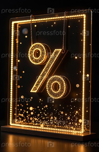 Неон светящийся золотой процентный знак на черном фоне. витрина магазина для Черной пятницы, распродажи, скидки, сумки для покупок. баннер, флаер. AI generated