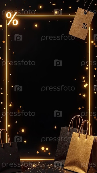 Неоновая светящаяся золотая рама с пространством для текста, процентный знак, сумки покупок на черном фоне. витрина магазина в Черную пятницу, распродажа, скидки, баннер, флаер. ИИ генерируется