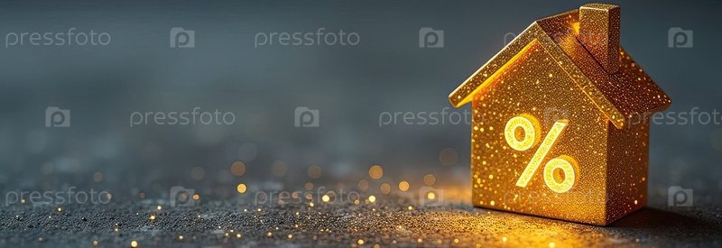 Золотой светящийся символ процент в доме на сером бетонном фоне с золотым блеском. строительство жилья, скидка, купон, покупка, продажа, риэлторская деятельность, ипотека, страхование, бронирование. AI generated