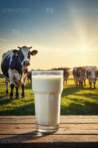 Свежее деревенское коровье молоко в кружке на столе на фоне луга, где пасутся коровы