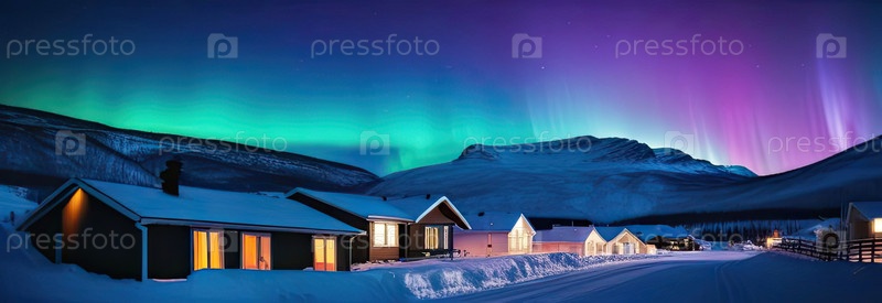 Северные огни в небе над северной деревней со снежными уютными домами зимой