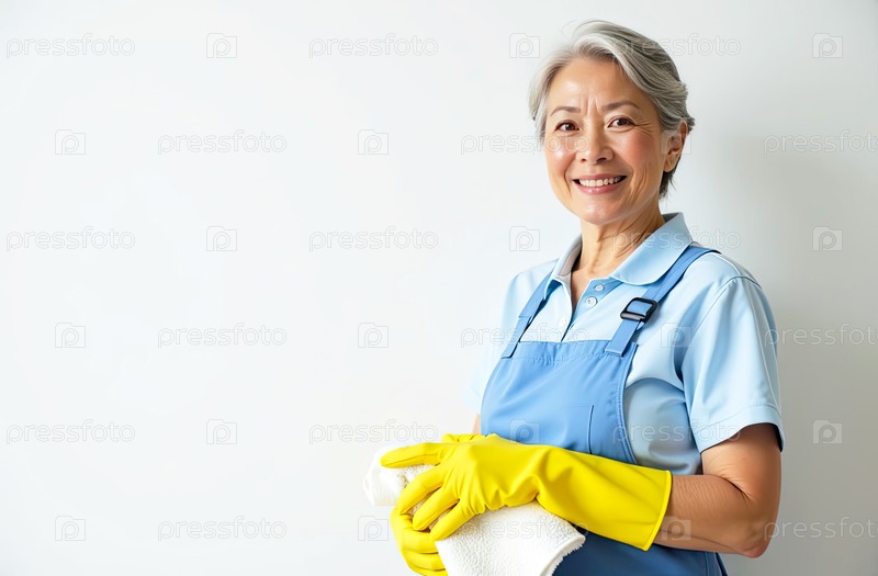Портрет взрослой азиатской женщины в синем фартуке и желтых резиновых перчатках с тряпкой в руке возле белой стены со свободным местом для текста, услуги очистки окон, уборки дома, горничной