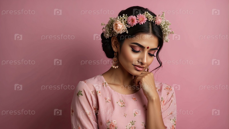 Индийская женщина с бокалом и розовым цветочным аксессуаром, розовый фон, портрет весенней красоты, женственность, мягкая культура, 8 марта, женский день