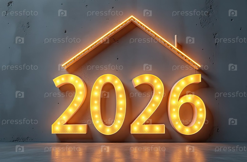 Прозрачное золото светящиеся номера 2026 под крышей дома на сером бетонном фоне с золотым блеском. недвижимость, риэлтор, ипотека, страхование, бронирование. ИИ генерируется