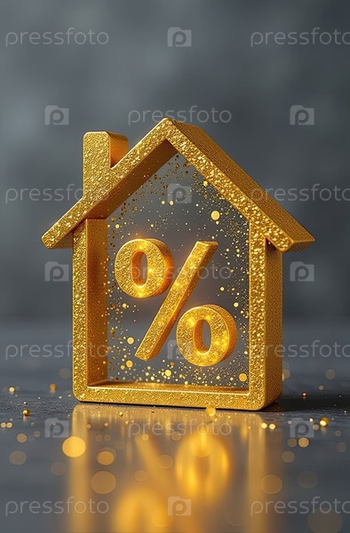 Золотой светящийся символ процент в доме на сером бетонном фоне с золотым блеском. строительство жилья, скидка, купон, покупка, продажа, риэлторская деятельность, ипотека, страхование, бронирование. AI generated