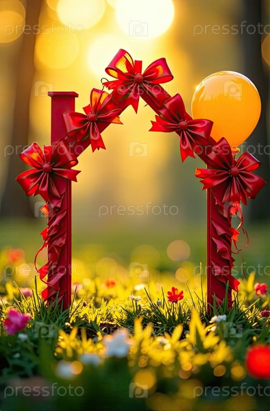 Крошечный каркасный праздничный дом в солнечных лучах, с воздушными шарами и луками, день рождения декор фоном на поле. недвижимость, дача, летний домик, ипотека, страхование, бронирование, строительство, изоляция. ИИ генерируется