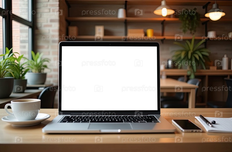 Ноутбук с белым экраном макет на фоне кафе в стиле лофт со стаканкой кофе на столе. удаленная работа, интернет, покупки. ИИ генерируется