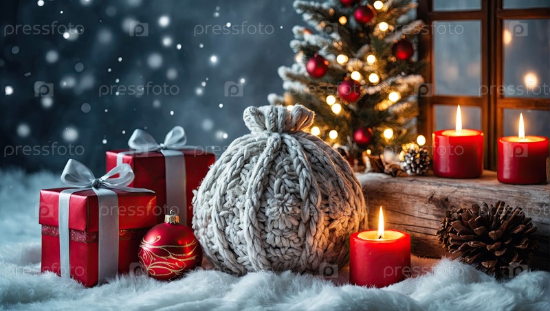 Рождественская открытка с кописпейсом на праздничном снежном фоне с елкой, рождественскими шарами, свечами, конусами и блеском