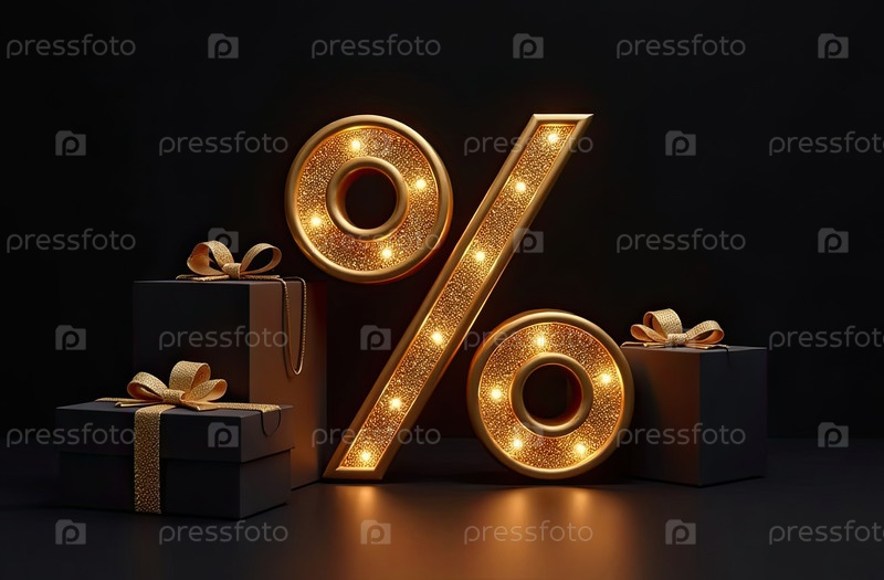Неон светящийся золотой процентный знак на черном фоне. витрина магазина для Черной пятницы, распродажи, скидки, сумки для покупок. баннер, флаер. AI generated