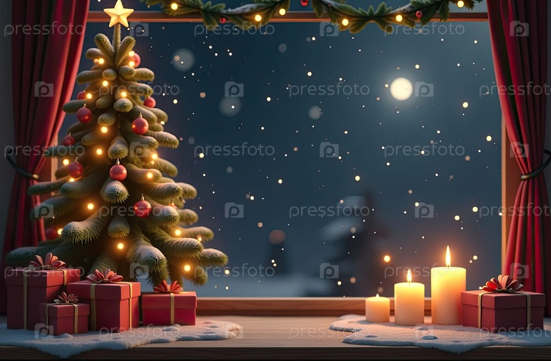Внутреннее уютное окно с рождественским декором и теплыми световыми гирляндами и свечами - внутренний вид зимой и снегом со спасом для текста. Отпразднуйте Рождество и Новый год, елку, боке. ИИ генерируется