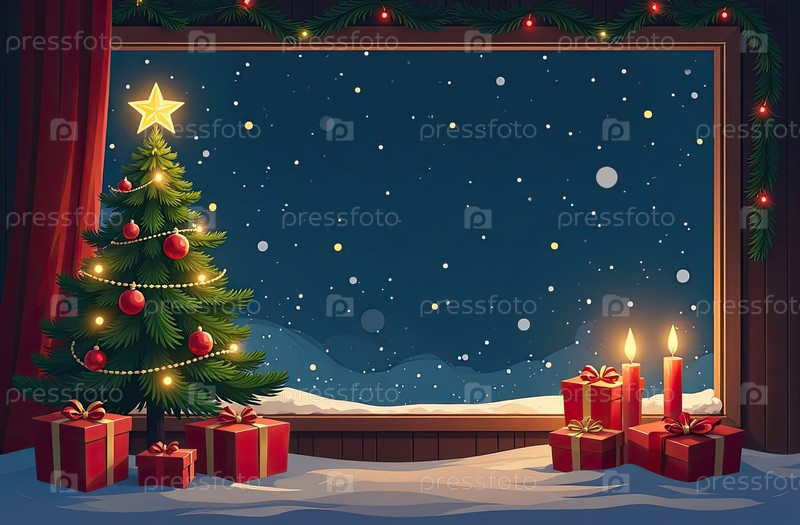Внутреннее уютное окно с рождественским декором и теплыми световыми гирляндами и свечами - внутренний вид зимой и снегом со спасом для текста. Отпразднуйте Рождество и Новый год, елку, боке. ИИ генерируется