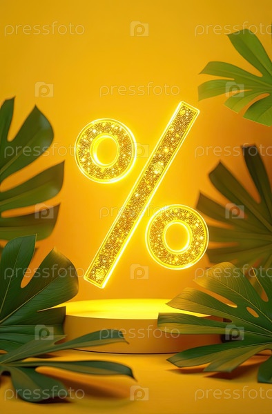 Яркий золотой процентный знак на желтом фоне с пальмами и тропическими растениями. жаркая летняя распродажа и скидки, горящий туристический баннер, флаер. ИИ генерируется