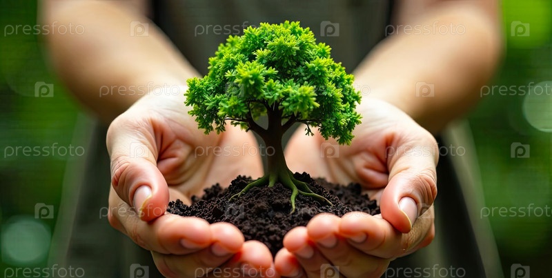 Крошечное зеленое дерево в горстке земли в руке в земле на близком расстоянии.Экология, уход, бонсай.Искусственный интеллект создан