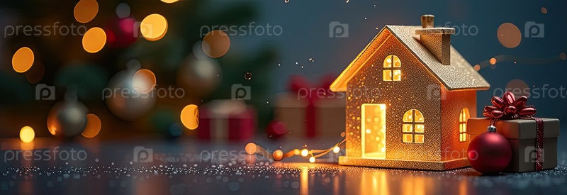Прозрачное золото светящийся символ дома и коробка для подарков под елкой на рождественском фоне с золотым блеском