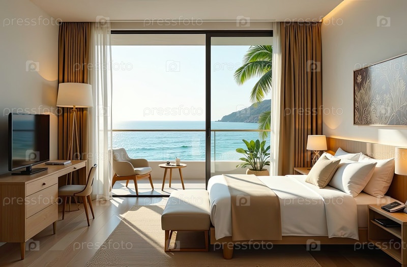 Интерьер гостиничного номера с видом на океан для пляжного отдыха и путешествий