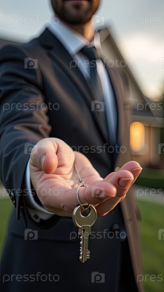 Недвижимость человек в костюме, держит ключ от дома в своей руке рядом с коттеджем - продажа, переезд, бронирование, проект коттеджа, ипотека, жилье и страхование недвижимости