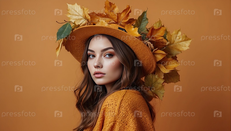Белая женщина в шляпе с желтыми и зелеными осенними листьями, портрет осенней красавицы, игривый стиль осени, сезонная мода