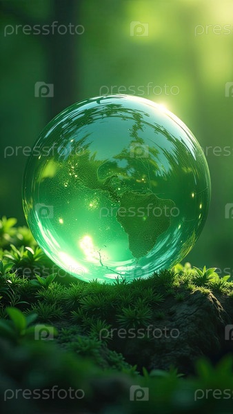 Стеклянная светящаяся сфера планеты Земля в лесу - это шар с внутренним микроклиматом, чистой окружающей средой, защищающий экологию планеты