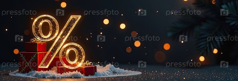 Неон светящийся золотой процентный знак на рождественском фоне с елкой, блесками и коробками для подарков. Черная пятница, Новый год, Рождественская распродажа, скидки. баннер, флаер с копировальным пространством. ИИ генерируется