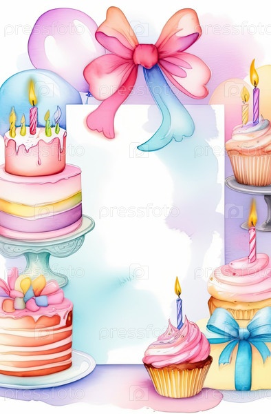 Вертикальная акварель рождественская рама, воздушные шары, торт, подарки, пространство для копирования поздравительной открытки или приглашения