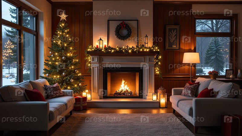 Современный яркий интерьер гостиной дома с камином с рождественским декором, теплыми золотыми огнями гирлянд, большими окнами со снегом и зимой