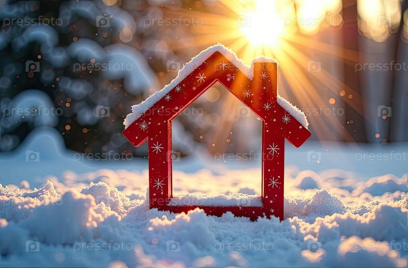 Уютный каркас крошечный дом на снегу и заснеженном фоне в солнечных лучах, с рождественским декором. недвижимость, риэлторская деятельность, ипотека, страхование, бронирование, зимовка, изоляция, отопление. ИИ генерируется