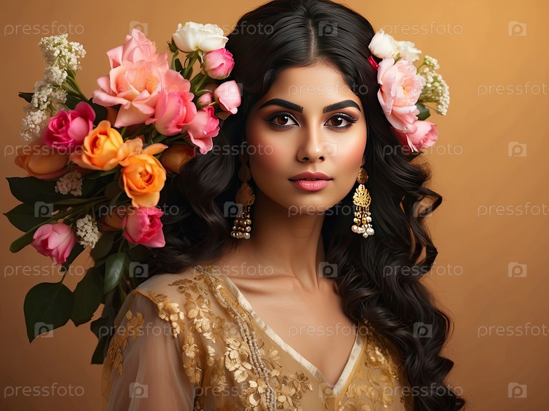 Индийская женщина с черными волосами и ярким цветочным головным убором, золотой фон, весенняя флористическая красота, традиционная элегантность, женственность, 8 марта, женский день