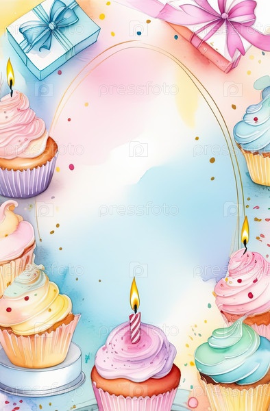 Акварельная рама для поздравительной открытки на день рождения, торта, подарков, синего пастельного цвета, копировальное пространство для пожеланий или сообщений