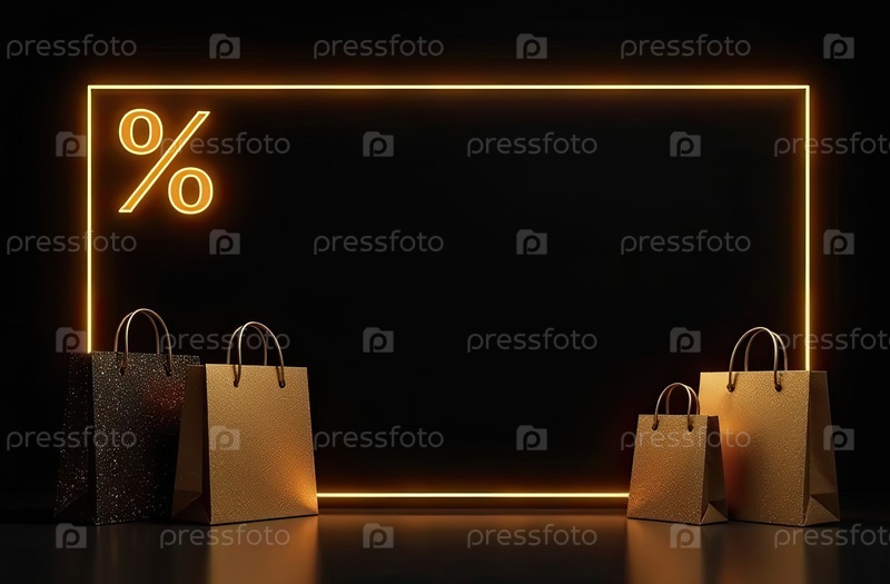 Неоновая светящаяся золотая рама с пространством для текста, процентный знак, сумки покупок на черном фоне. витрина магазина в Черную пятницу, распродажа, скидки, баннер, флаер. ИИ генерируется