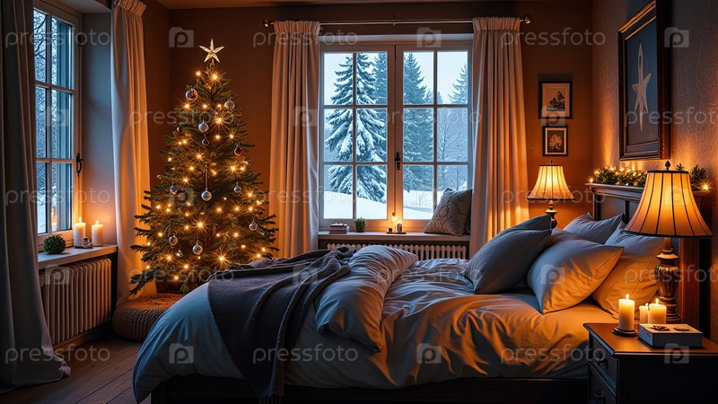 Уютная спальня с кроватью у окна с рождественским декором и елкой, теплыми гирляндами света и свечами - вид изнутри зимой и снегом. Отпразднуйте Рождество и Новый год, рождественское настроение. ИИ генерируется