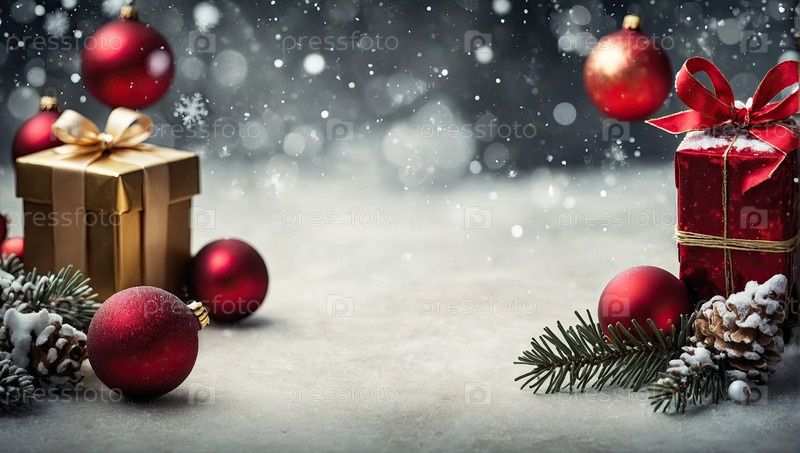 Рождественская открытка с кописпейсом на праздничном снежном фоне с елкой, рождественскими шарами, свечами, конусами и блеском