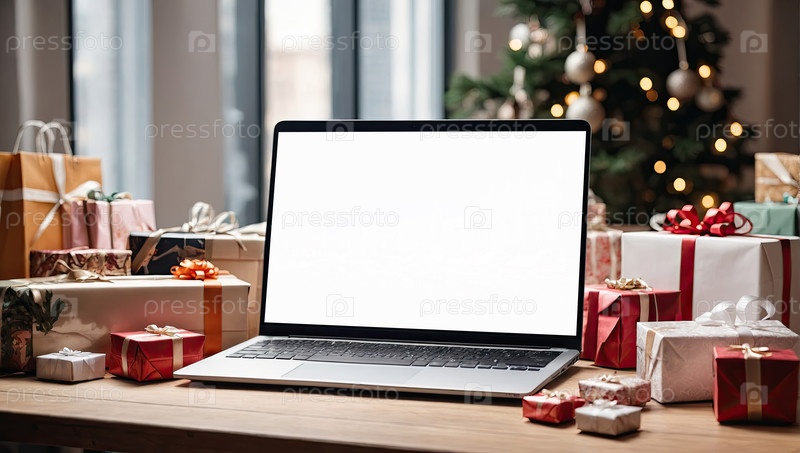 Ноутбук с белым экраном макет на столе в офисе рождественского декора с подарочными коробками для сотрудников, магазины, корпоративные подарки, Черная пятница,