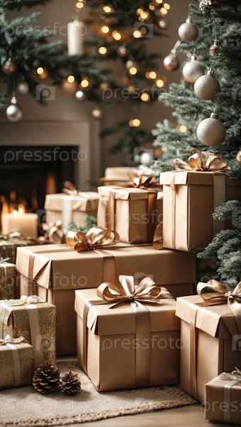 Рождественский фон с подарочными коробками с луками в нейтральных тонах естественного эко-стиля, боке и фейри-светом, рождественская елка во внутреннем интерьере дома. праздничное настроение Рождество и Новый год, открытка, созданный ИИ