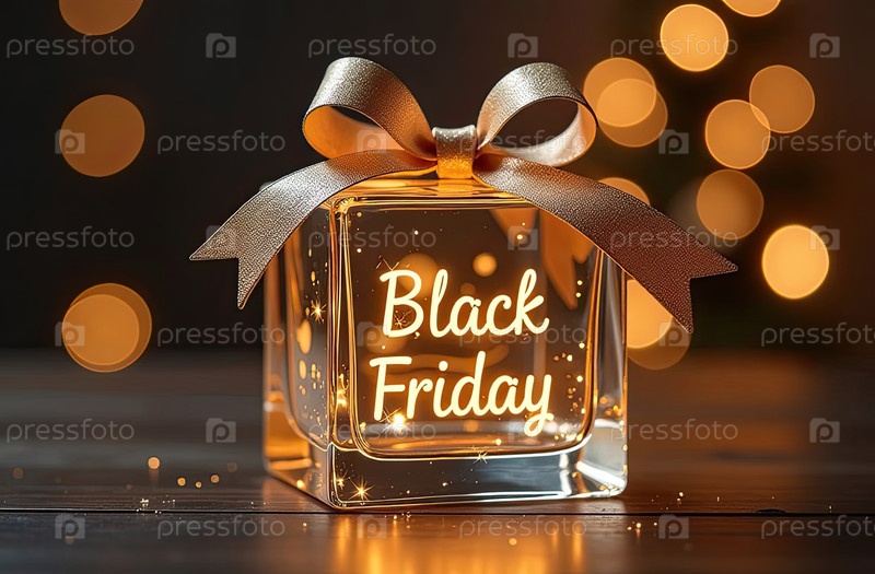 Неоновые светящиеся золотые буквы "Черная пятница" на прозрачной подарочной коробке с праздничным фоном золотистого бока. витрина магазина для Черной пятницы, распродажи, скидки, листовки, созданные ИИ