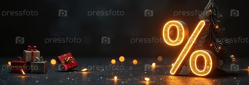 Неон светящийся золотой процентный знак на рождественском фоне с елкой, блесками и коробками для подарков. Черная пятница, Новый год, Рождественская распродажа, скидки. баннер, флаер с копировальным пространством. ИИ генерируется